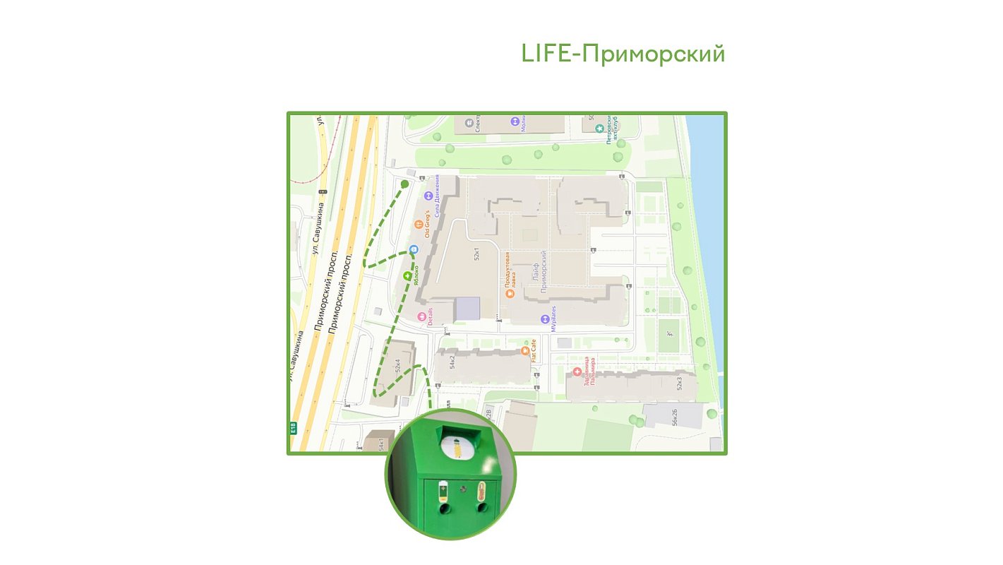 Чтобы обеспечить централизованный сбор и передачу опасных отходов на переработку, на территории жилых комплексов (YE`S, LIFE-Приморский, LIFE-Лесная, Шуваловские Высоты) установлены специальные трехсекционные контейнеры (экобоксы).
